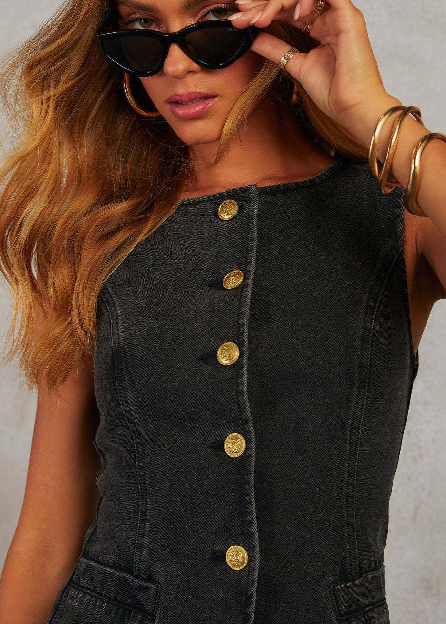 Le gilet en jean cintré impose une allure élégante et structurée. Ses boutons métalliques et ses poches passepoilées soulignent un design soigné qui met la taille en valeur.
