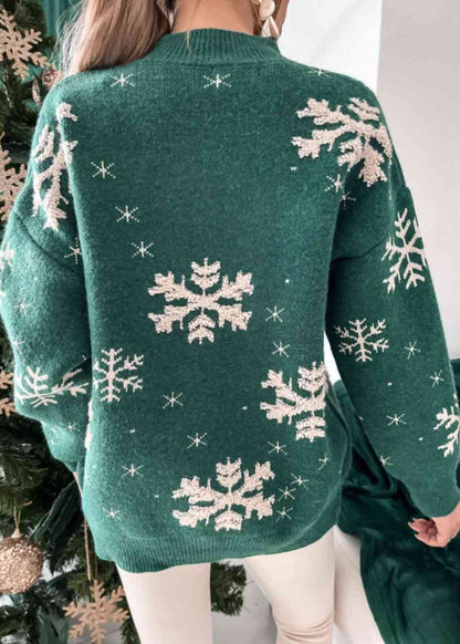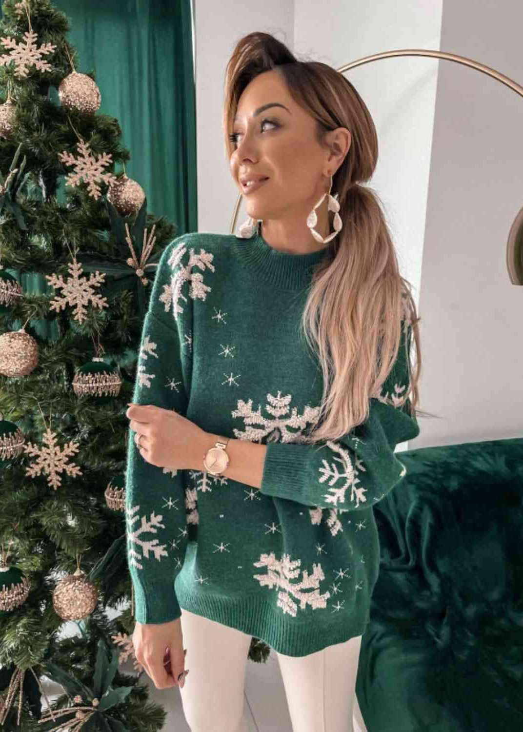 Le Pull Flocon Chic séduit par son motif flocons graphique et sa coupe confortable. Le col montant doux et les manches longues structurent la silhouette tout en gardant une allure moderne et lumineuse.