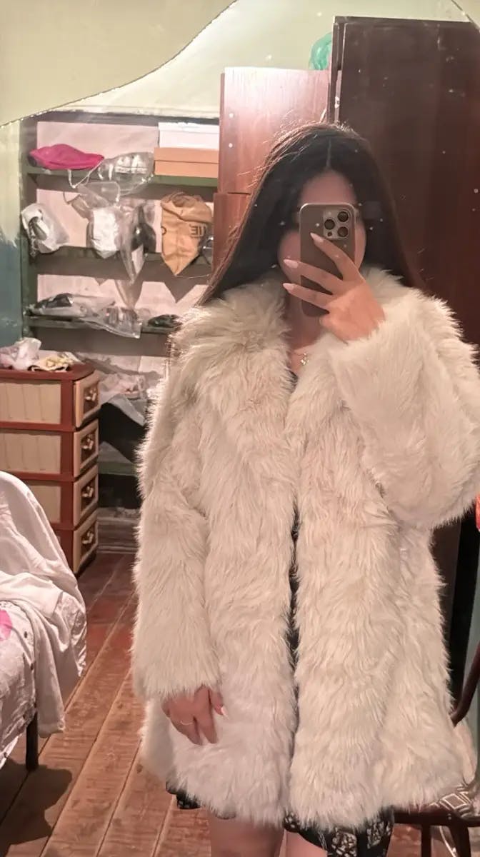 Le Manteau Fourrure Éclat Ivoire séduit par son volume luxueux et sa texture ultra-douce façon peluche. Sa coupe droite, ses manches généreuses et son col à revers créent une allure chic et lumineuse qui capte le regard.